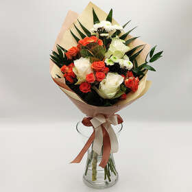 Virágbox narancs rózsával, krém csokros rózsával, zöld liziantussal. A virágok és a doboz beszerezhetőségtől és szezontúl függöen eltérhetnek.