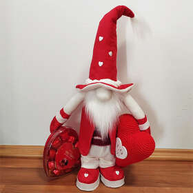 Farmer anyagból készült manócska. Mellé egy táblás csoki "Szeretettel" felirattal. Magassága kb. 68 cm.